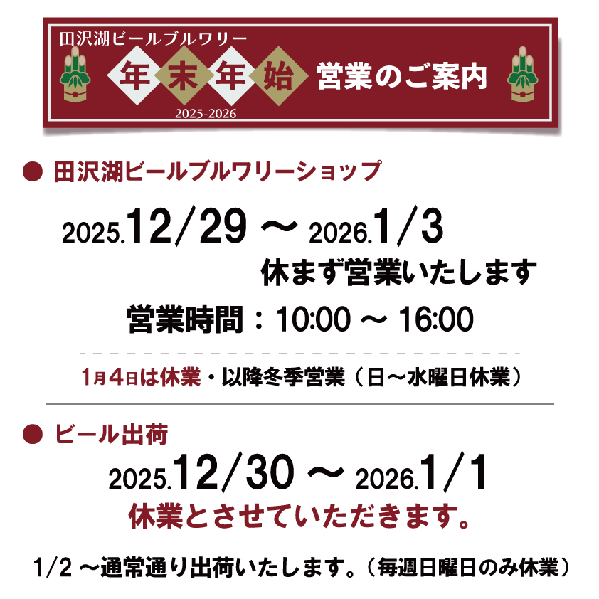 ■田沢湖ビールブルワリーショップ 年末年始(12/29~1/3)休まず営業いたします!(営業時間:10:00~16:00) ※12/28(日)・1/4(日)は通常定休日のためお休みです。 お正月用のビールやお年賀等に是非お越しくださいませ。 ▶アクセスはこちら ※1/4~3月中は冬季営業(日~水曜日休業)となります。